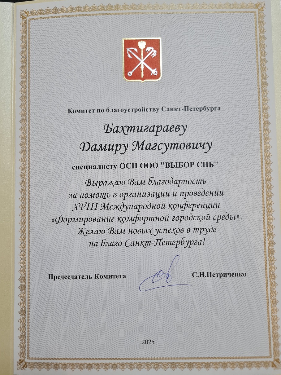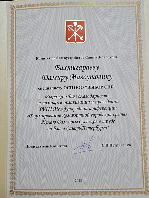 Компания «Выбор» была награждена почетной грамотой за то, что вносит вклад в развитие качественного благоустройства в стране.